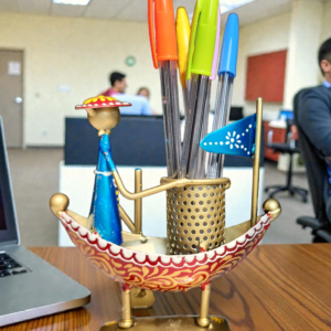 Handcrafted metal pen stand with a beautiful traditional boat theme and artistic figures. Stylish desk organizer for pens and stationery, perfect for office, study table, and gifting. Durable, hand-painted, and elegant table decor piece.