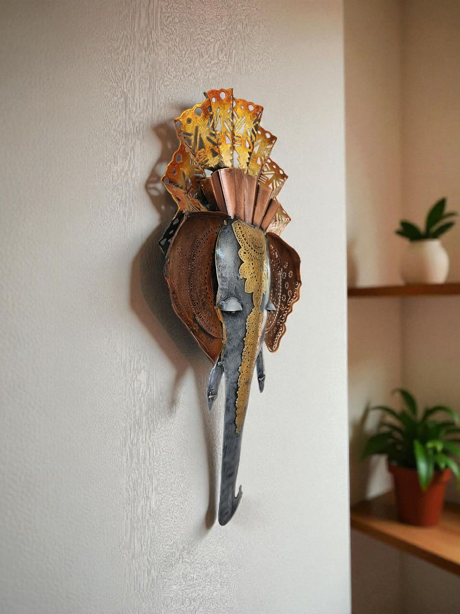 Crafted from high-quality metal, this décor piece features a striking combination of antique grey, copper, and golden tones that give it a rich and premium look. The finely designed crown and ears showcase delicate cutwork patterns, while the gold-highlighted Ganesha face adds a divine and royal touch to the overall design.