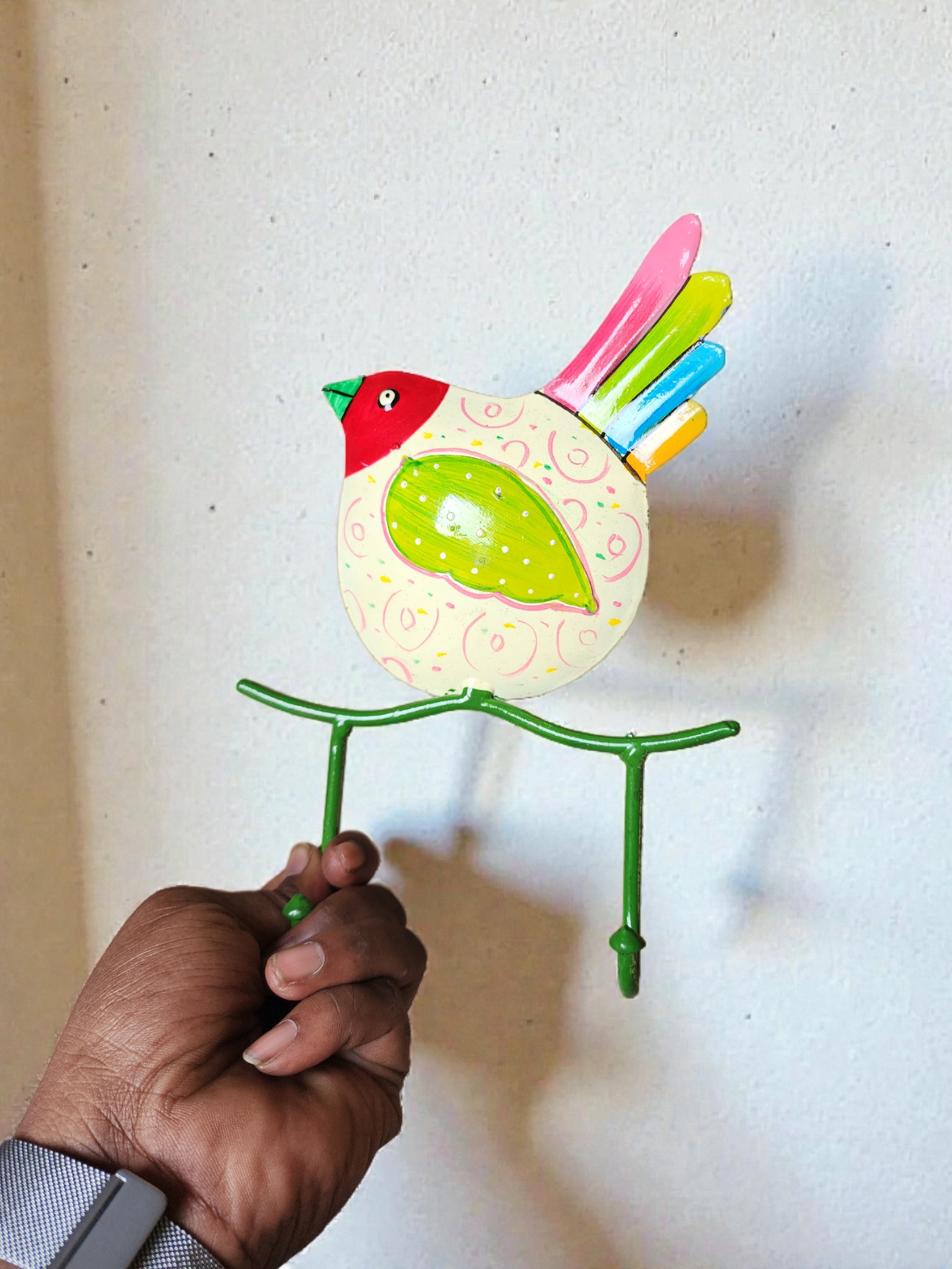 Yeh colorful bird-shaped iron wall hook aapke home décor ko ek playful aur artistic touch deta hai. Hand-painted finish aur bright colors isse kids room, kitchen ya entryway ke liye perfect banate hain. Strong iron body ke saath 2 hooks diye gaye hain jo keys, towels, masks ya light accessories hang karne ke liye ideal hain. Compact size ke bawajood yeh décor aur utility dono provide karta hai.