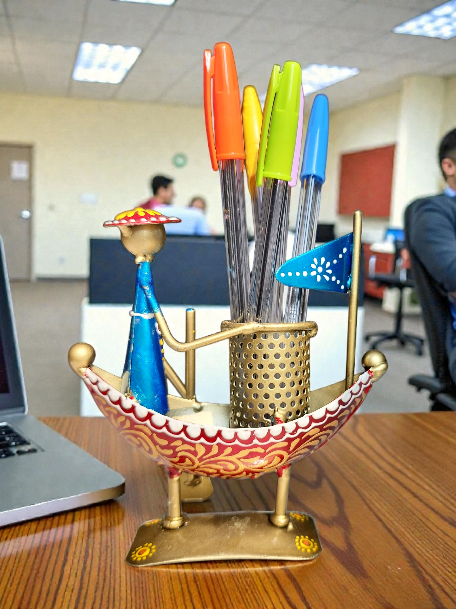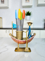 handcrafted Kerala boat-shaped metal pen stand. Measuring 5×1.5×5.5 inches, this exquisite piece combines functionality with ethnic charm, serving as both a desk organizer and a decorative showpiece.