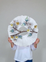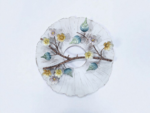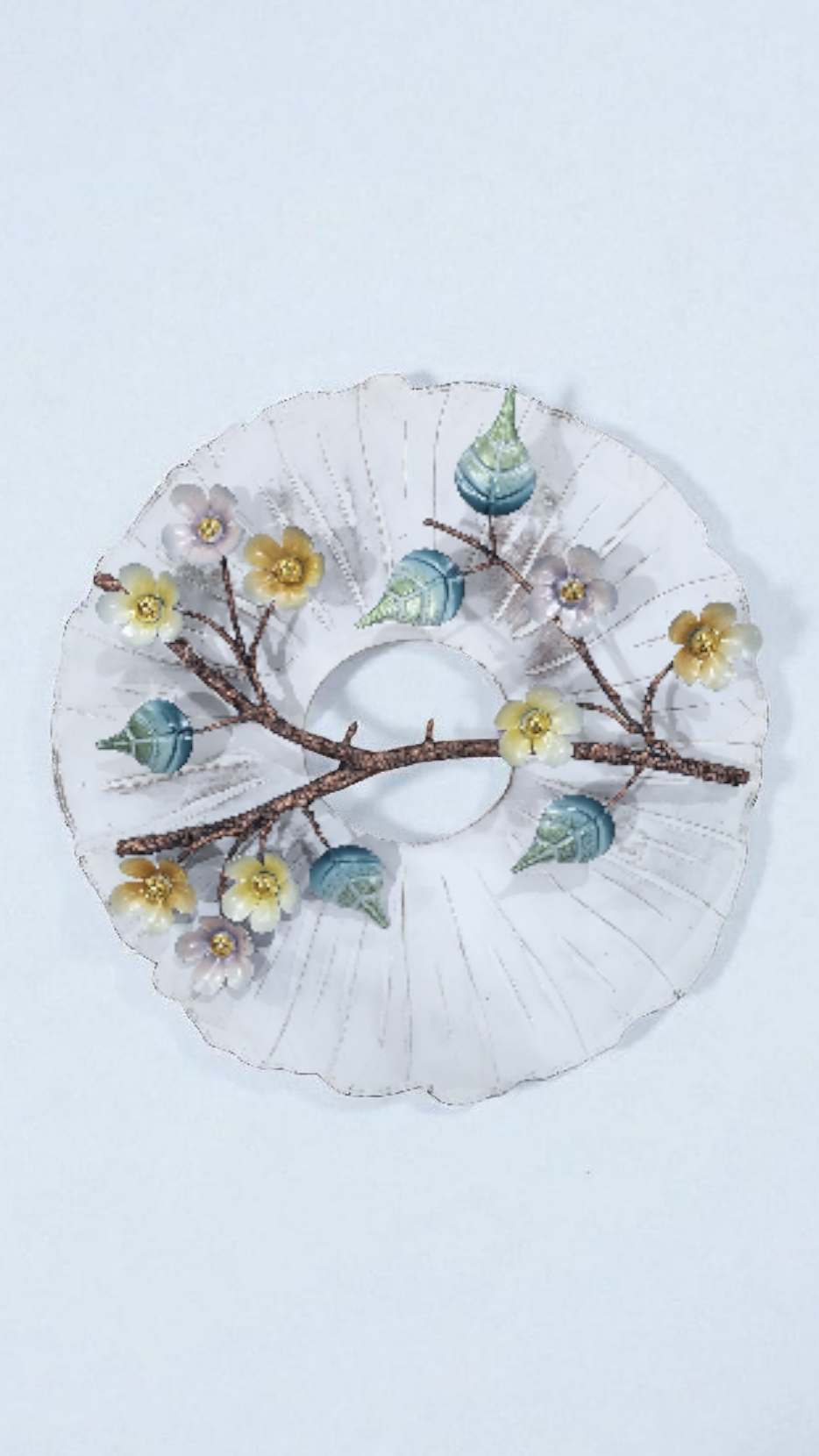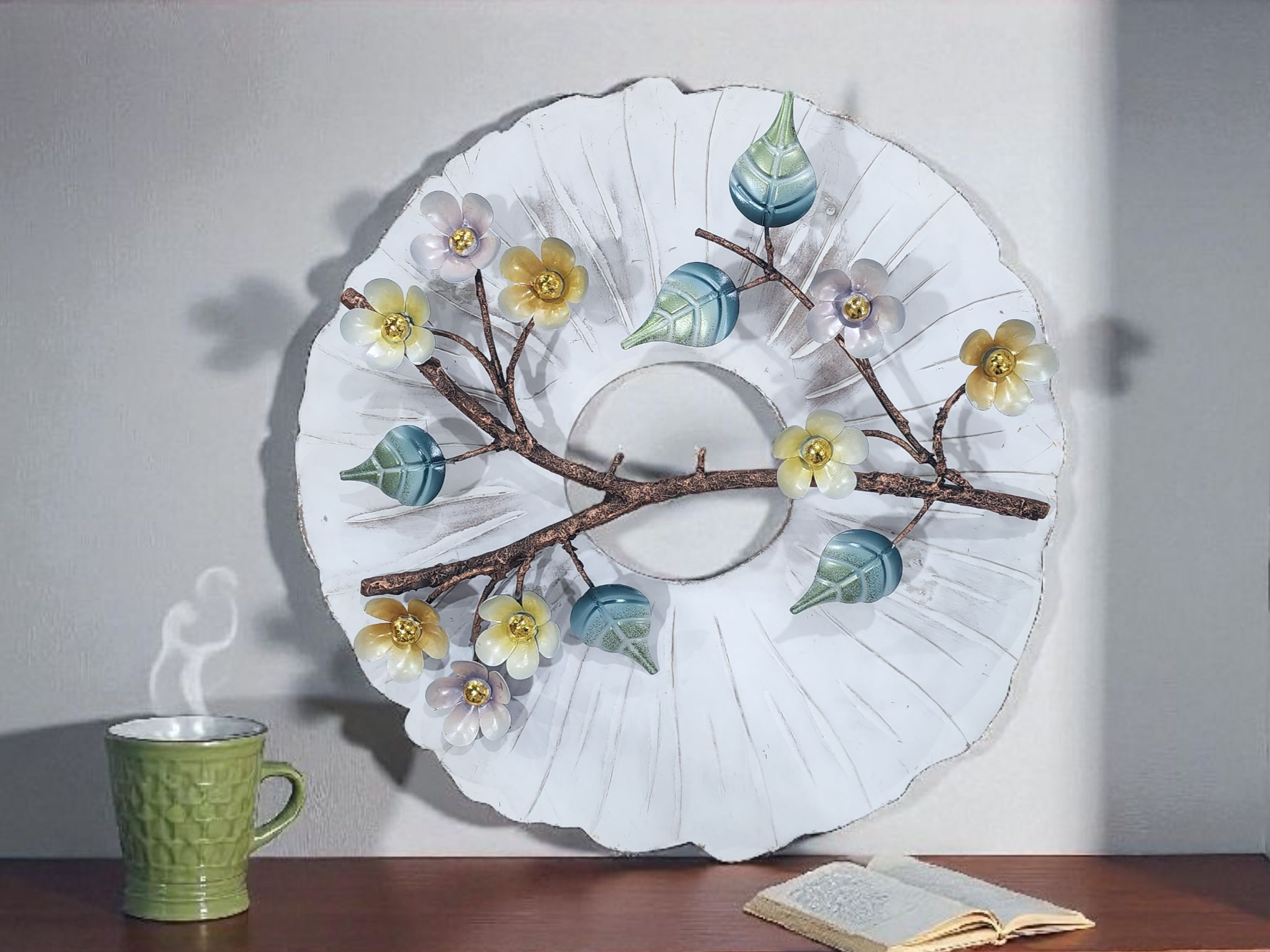 🌸 Design: The decor features a realistic-looking brown branch with delicate, multi-colored flowers and leaves attached. The flowers are in soft hues of pale yellow, grey, and white, while the leaves boast a glossy finish in shades of blue and green.