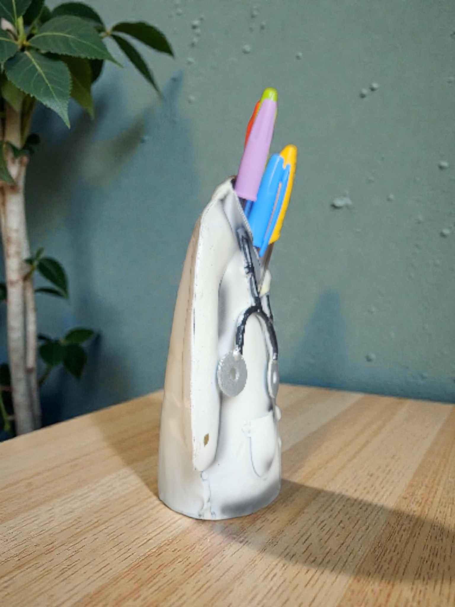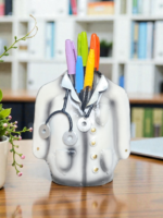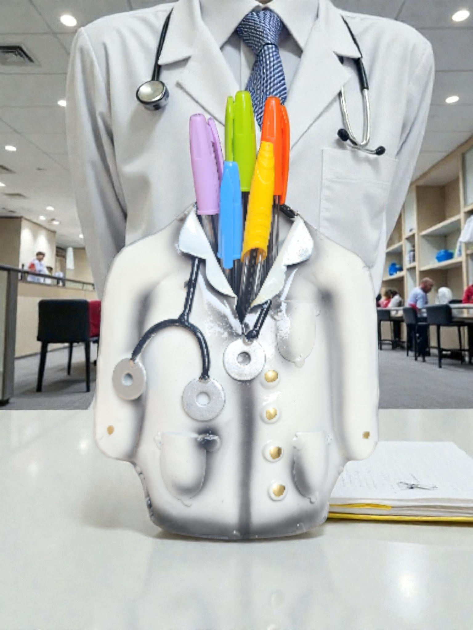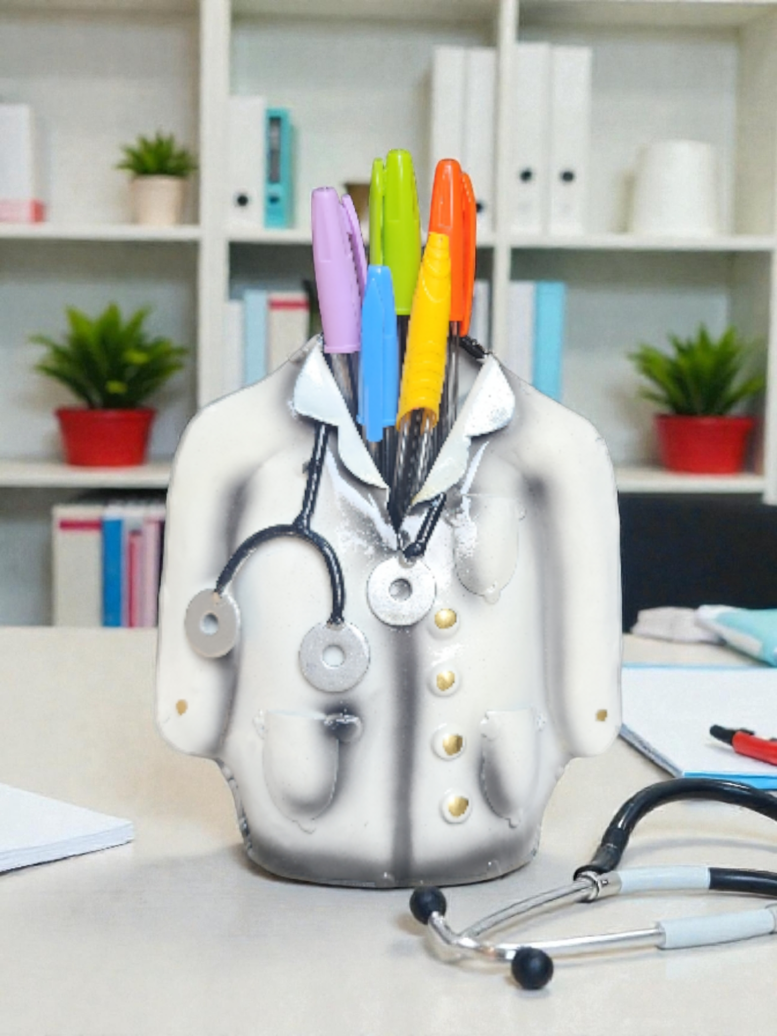 Doctor Coat Shape Pen Stand clinic desk, hospital reception, study table, office desk aur home workspace ke liye suitable hai. Medical theme design hone ki wajah se yeh doctor cabins aur OPD tables ke liye perfectly match karta hai. Yeh sirf ek organizer nahi, balki ek unique medical showpiece bhi hai.